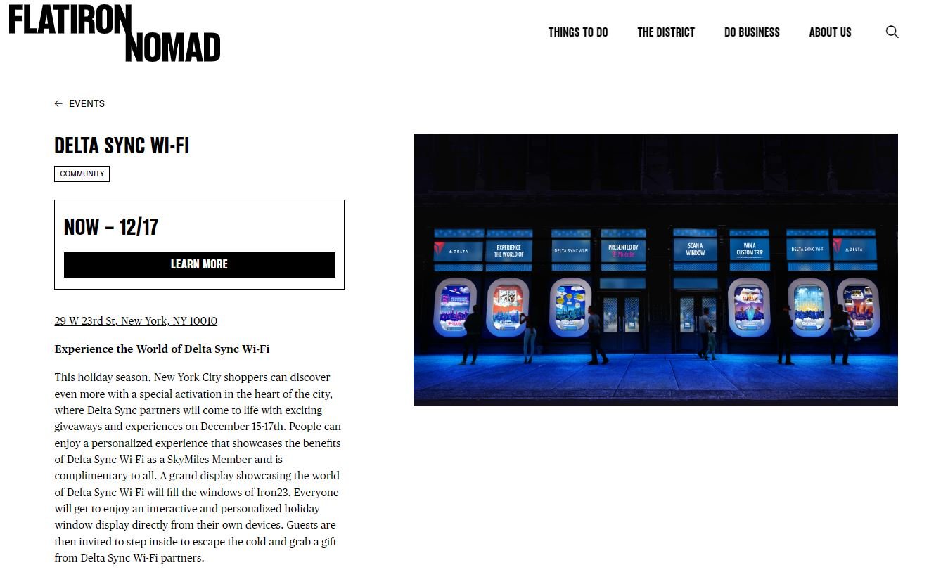 Challenge / Objective: Delta Sync Wi-Fi came to life for holiday shoppers in NYC with a Flatiron storefront takeover December 14-17, 2023. A incredible series of holiday window displays told the story of how you can customize your travel with Delta Sync Wi-Fi and all its partners. Holiday consumers were encouraged to scan a QR code in each window to launch a mobile experience where they could customize their own holiday journey and then enter for a chance to win a Delta Air Lines gift card. Inside, guests could escape the cold and grab a complimentary drink, snack and gifts from Delta Sync Wi-Fi brands, while learning more about Delta Sync.